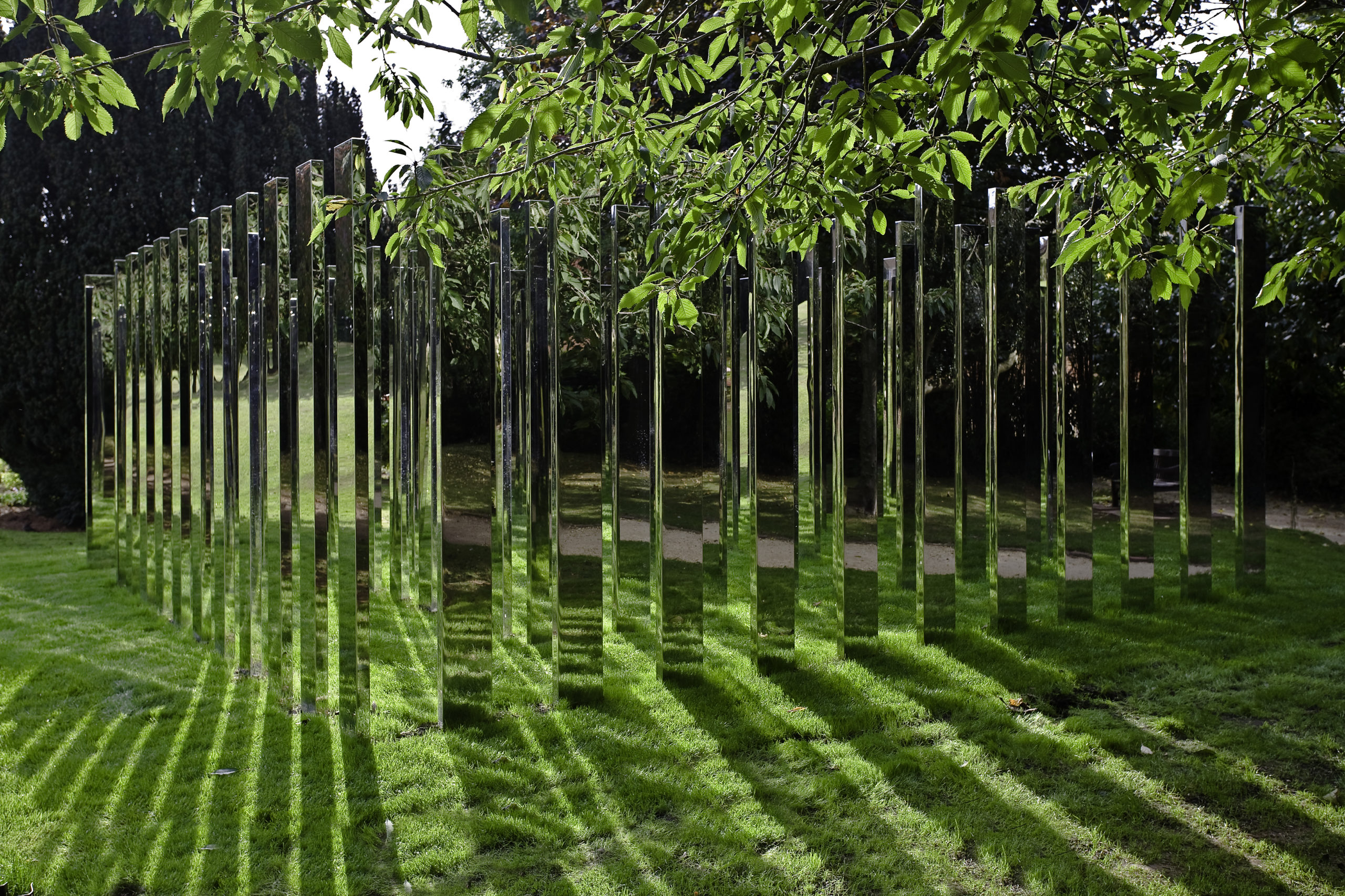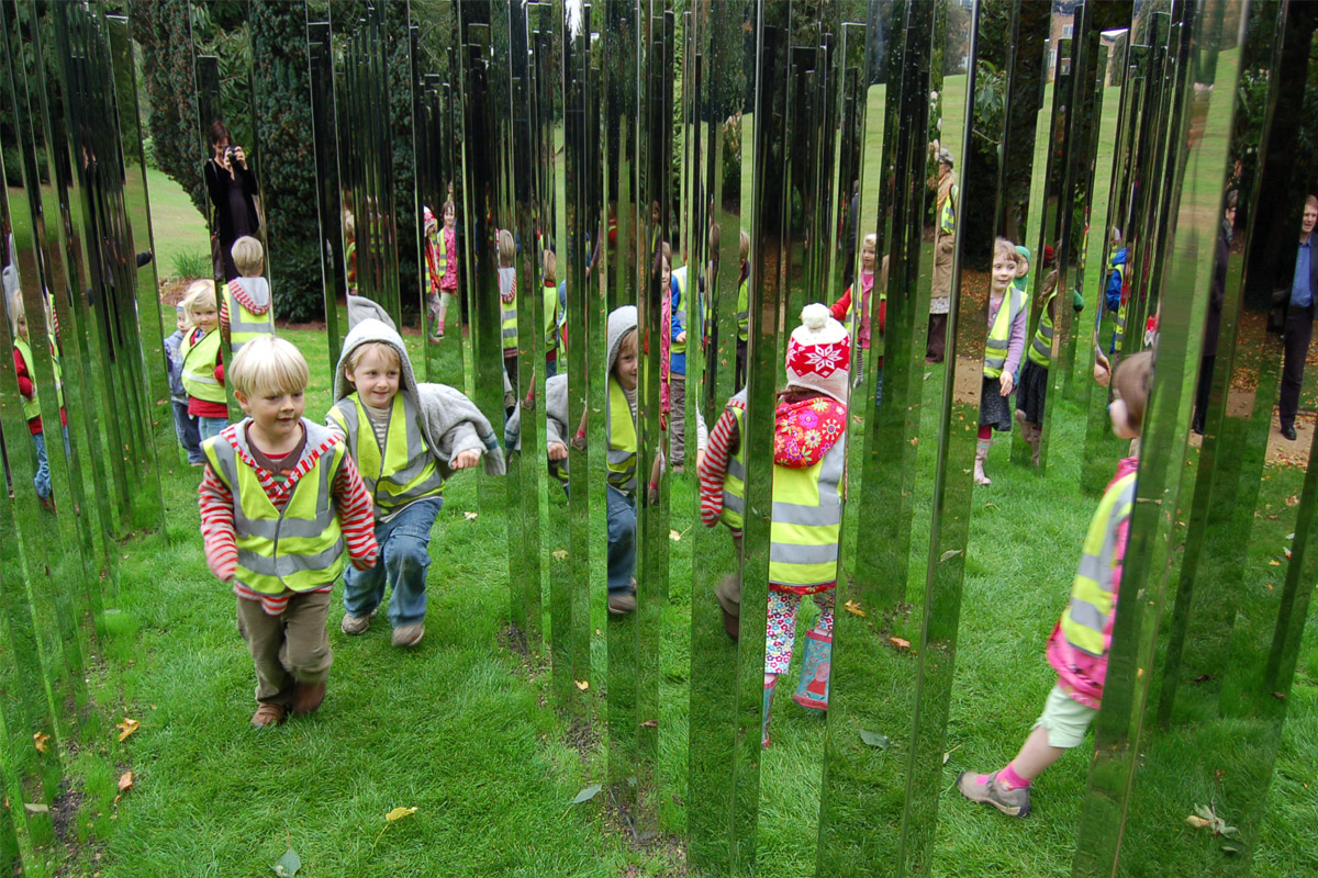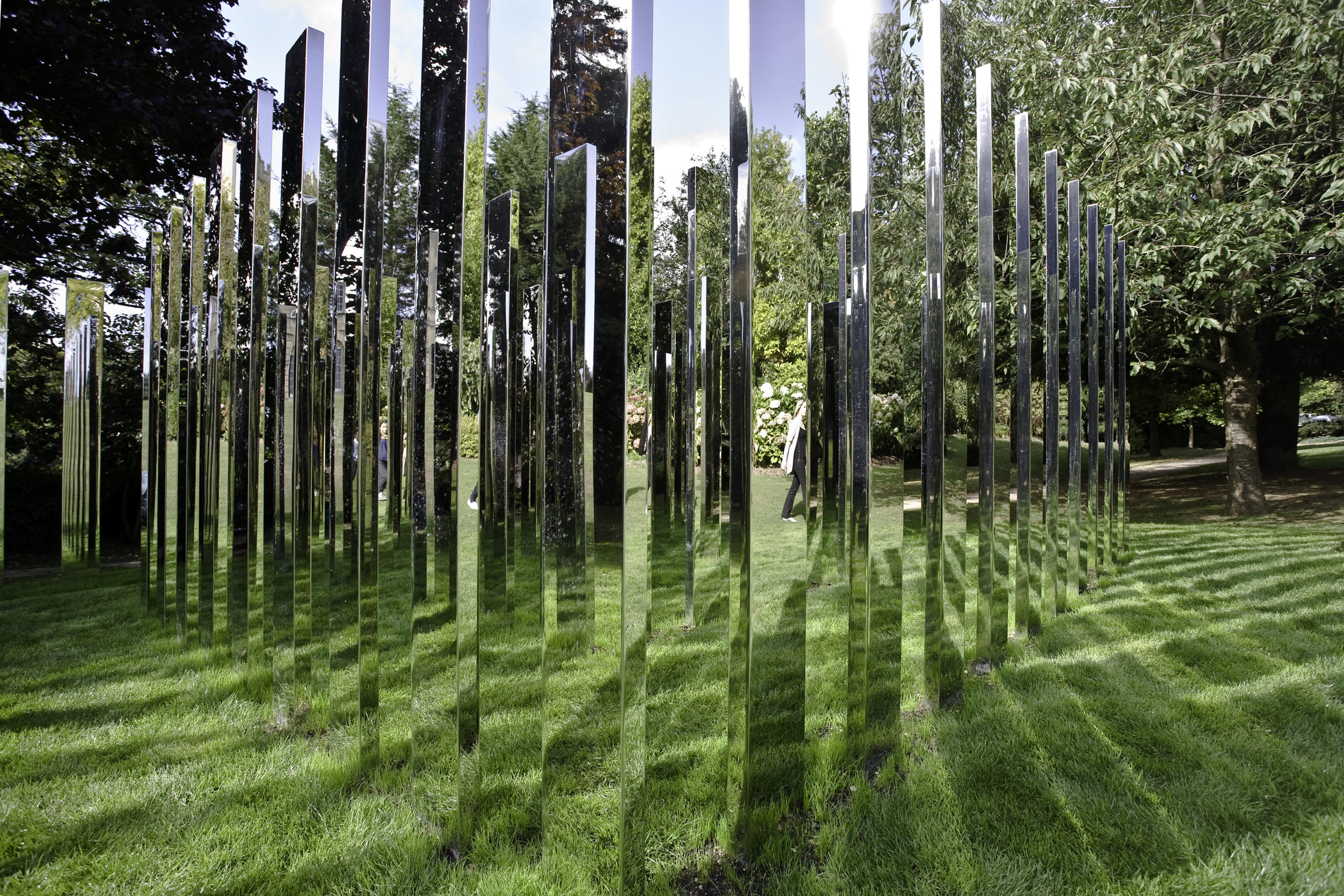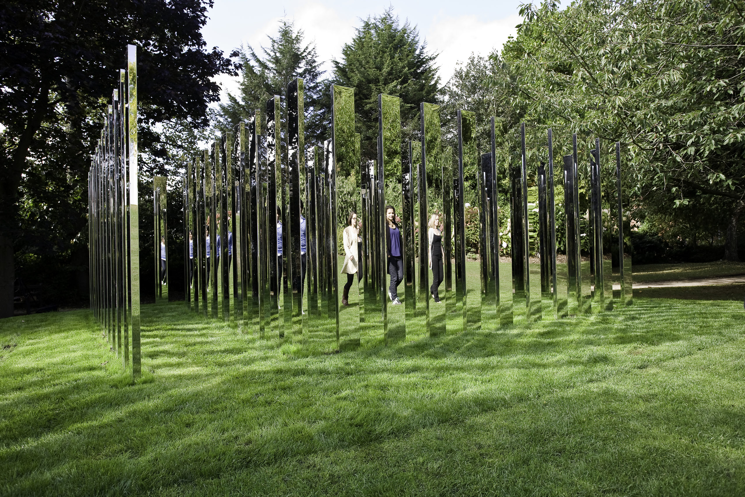 For Royal Fort Gardens, Hein created a square formation of 76 vertical polished steel plates sited at the base of an incline leading down from Royal Fort House. Entering the labyrinth, the surrounding landscape and participants are multiplied through a dizzying set of reflections.