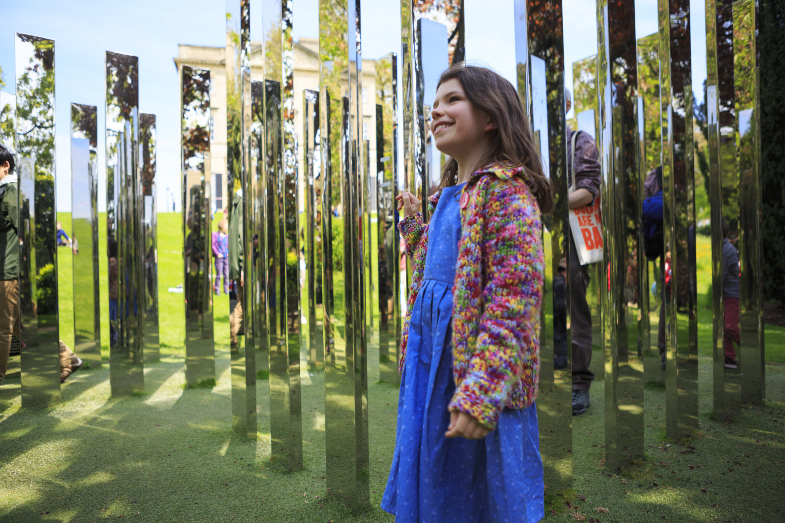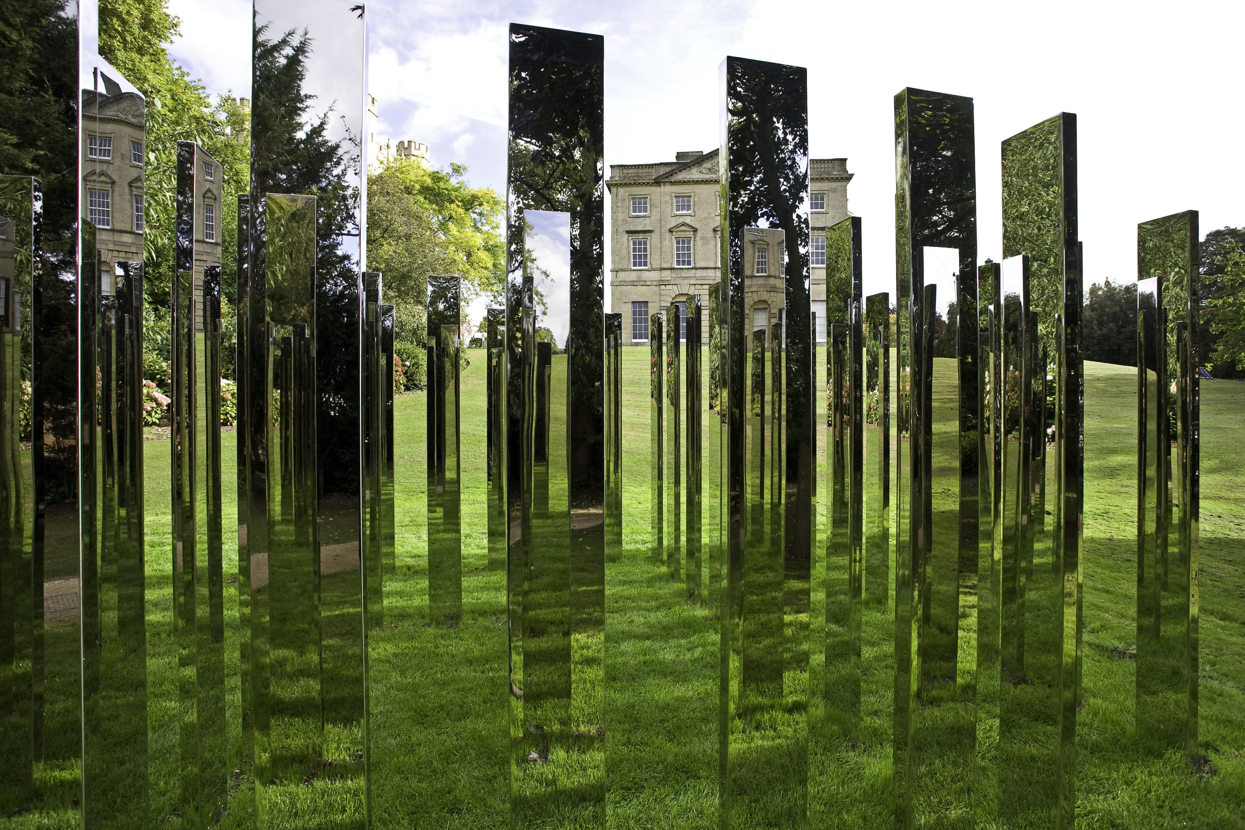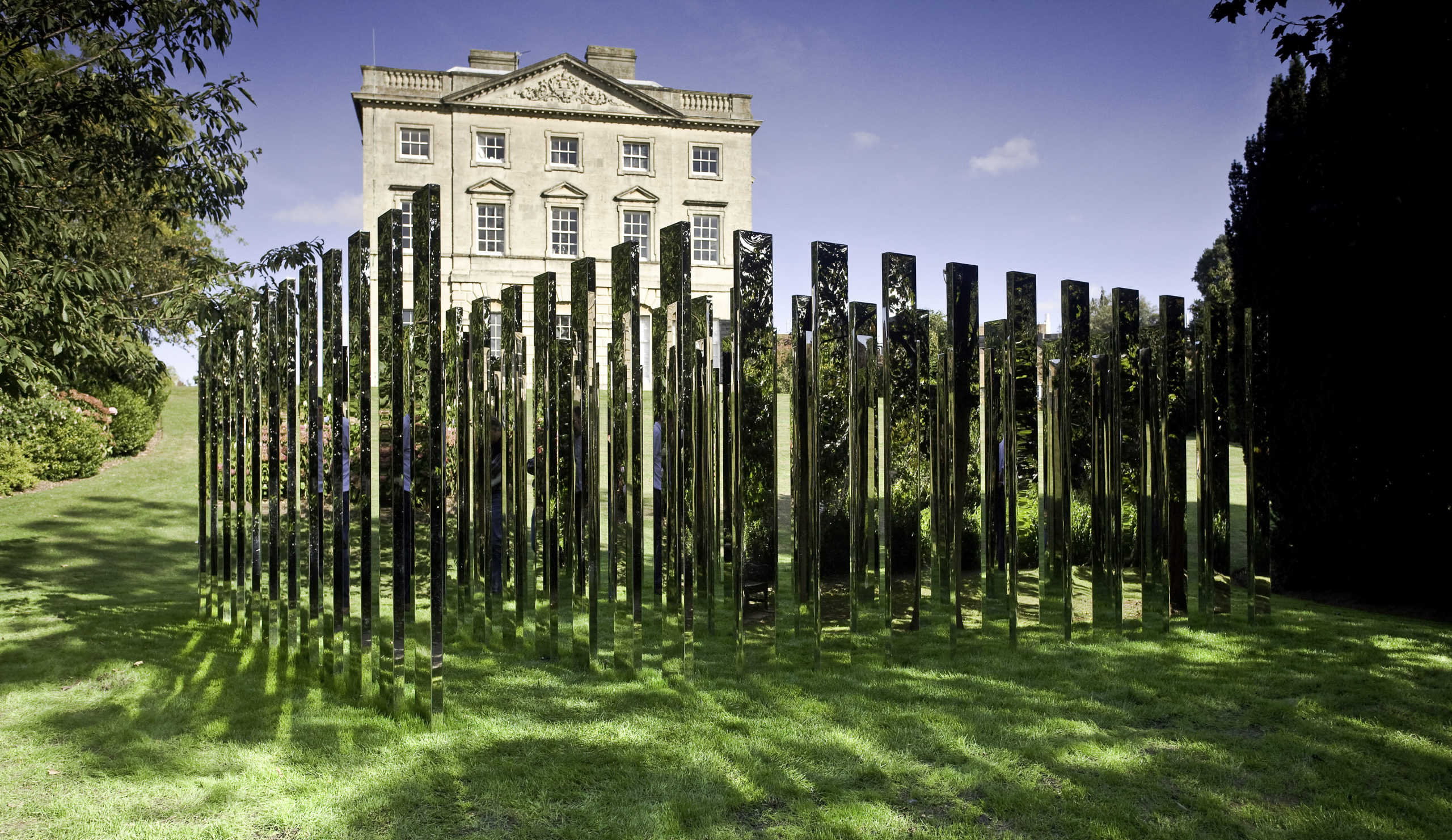 For Royal Fort Gardens, Hein created a square formation of 76 vertical polished steel plates sited at the base of an incline leading down from Royal Fort House. Entering the labyrinth, the surrounding landscape and participants are multiplied through a dizzying set of reflections.