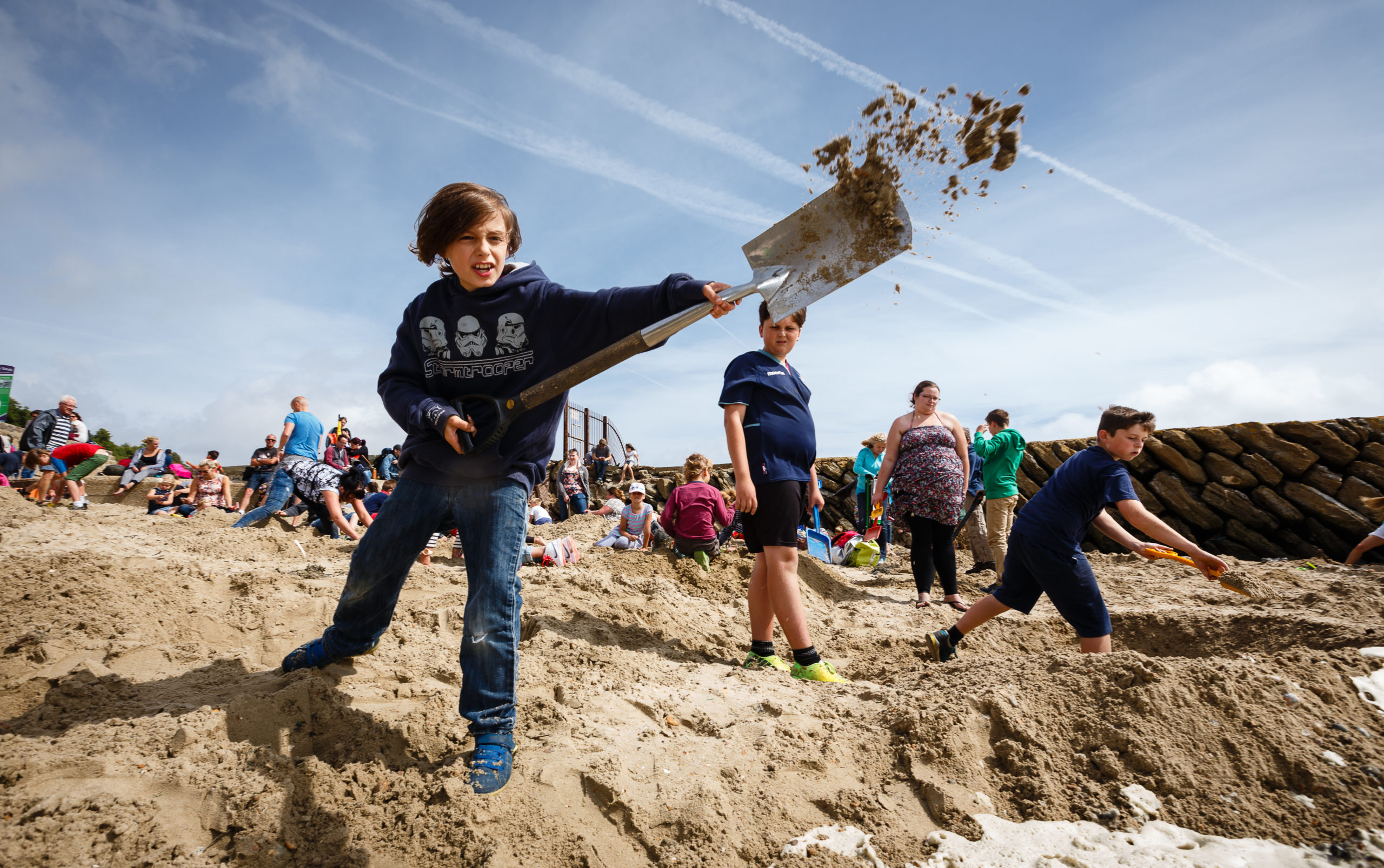 The mass digging of the beach also created its own piece of land art, with craters, hills and holes, washed away when the tide comes in. The next day, the day’s diggers create a new piece of art. Families spent days in the sunshine, digging and playing in the sand and new friendships were made.