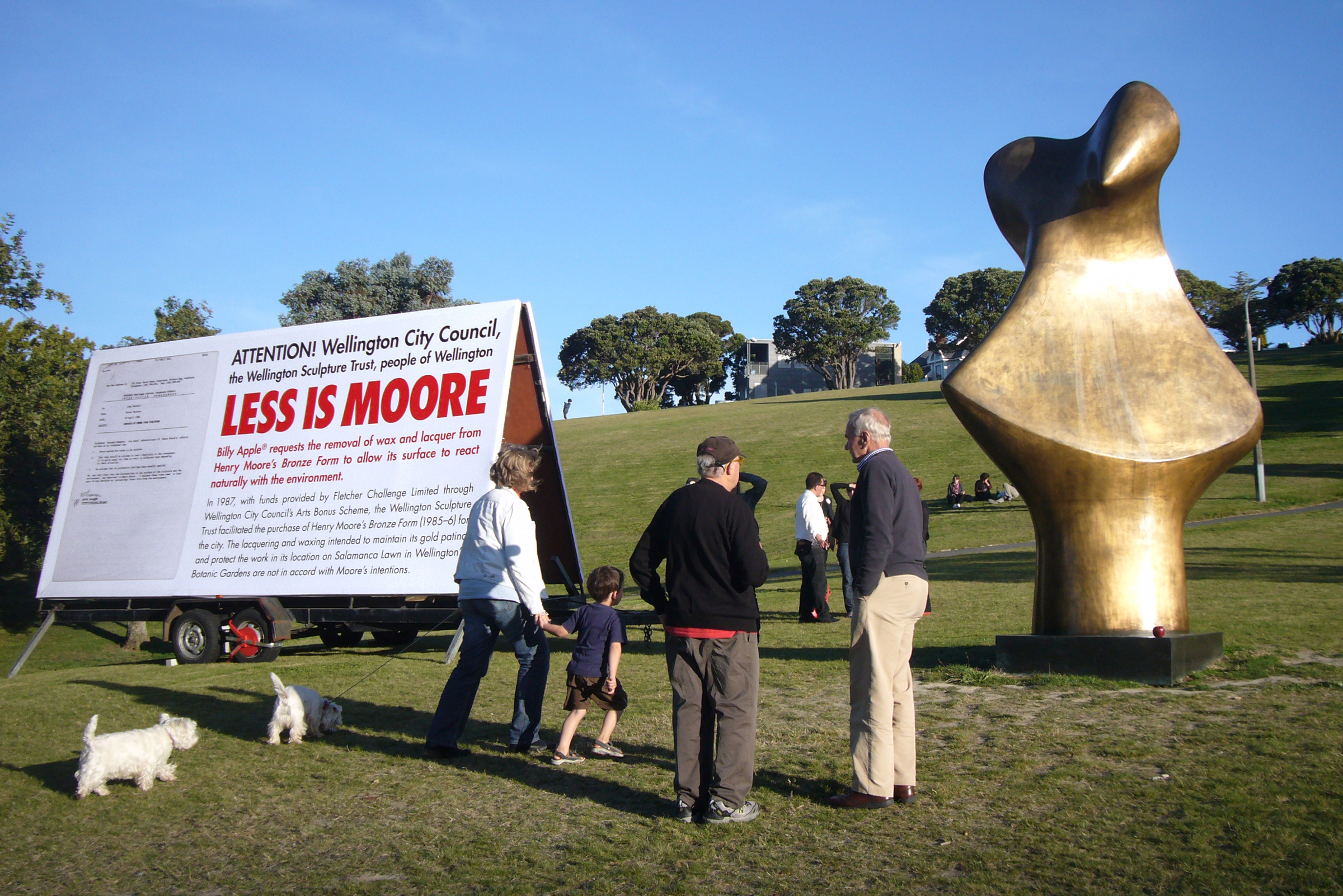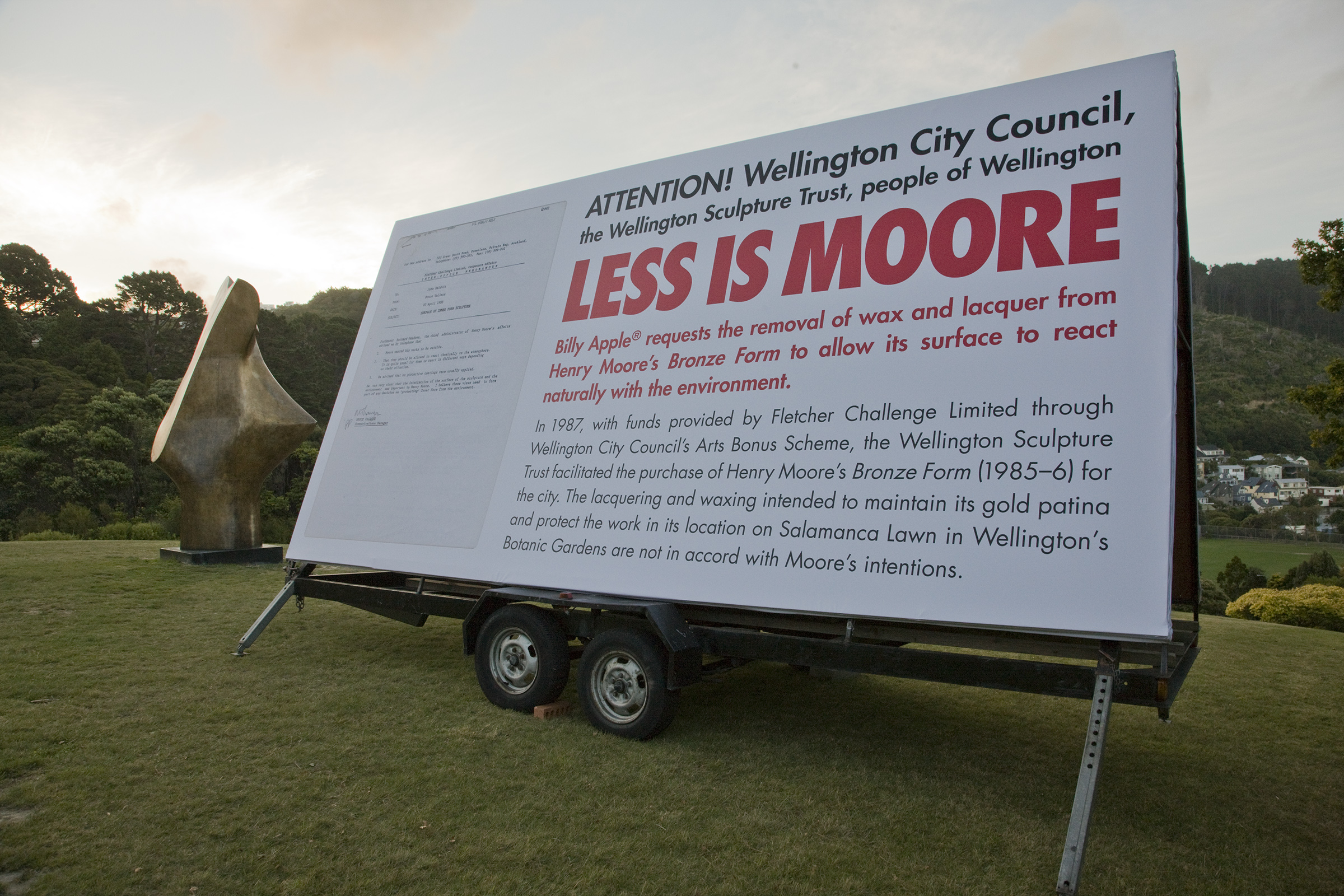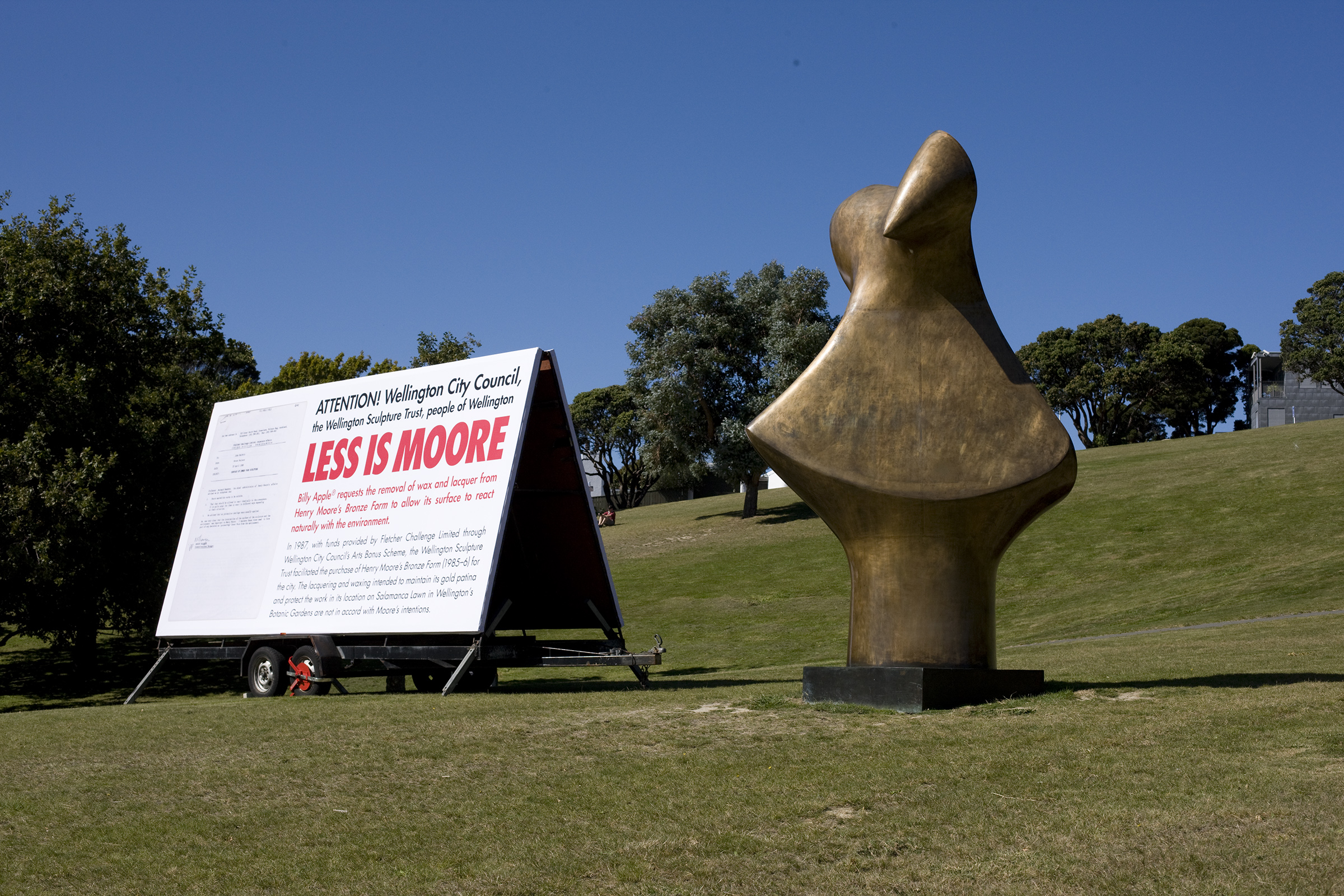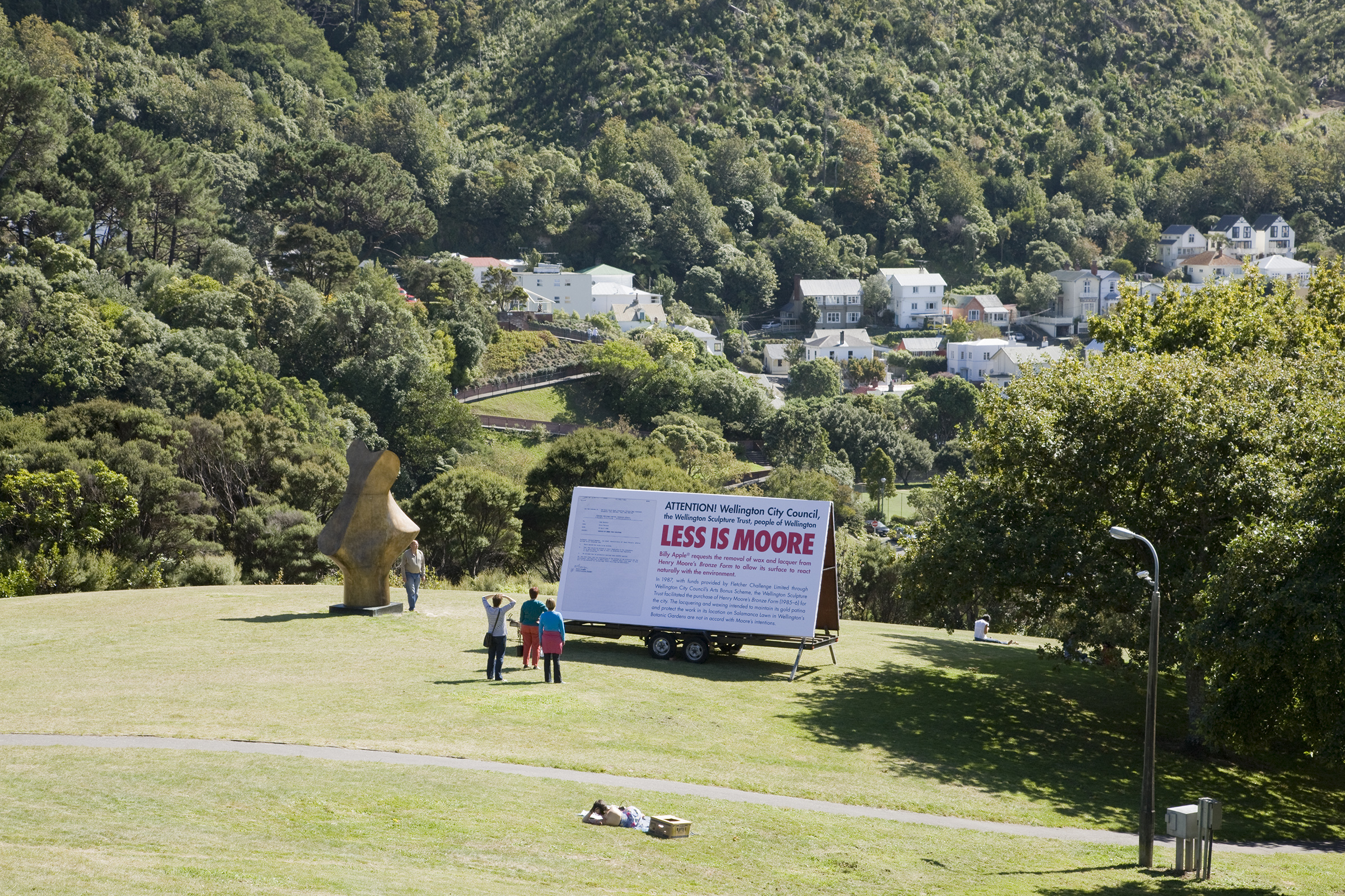 Playing with the conceptual and physical distance between modern outdoor art and contemporary site-based practice, Apple’s One Day Structure comprised of a billboard placed next to Henry Moore’s Organic Form No.1 in Wellington’s Botanic Gardens.