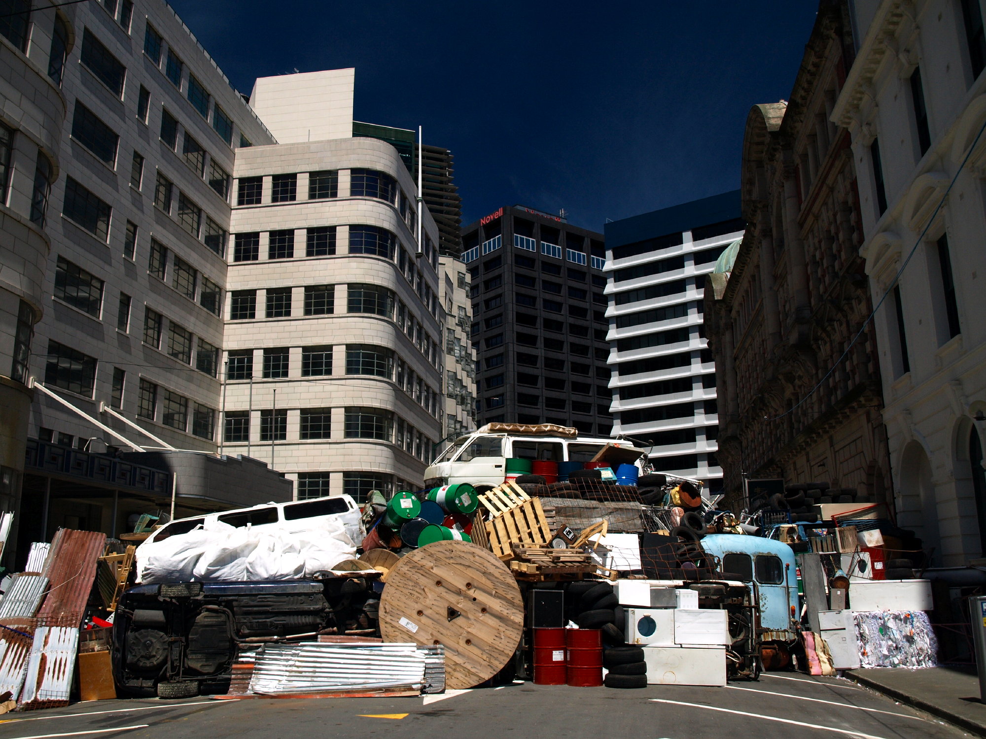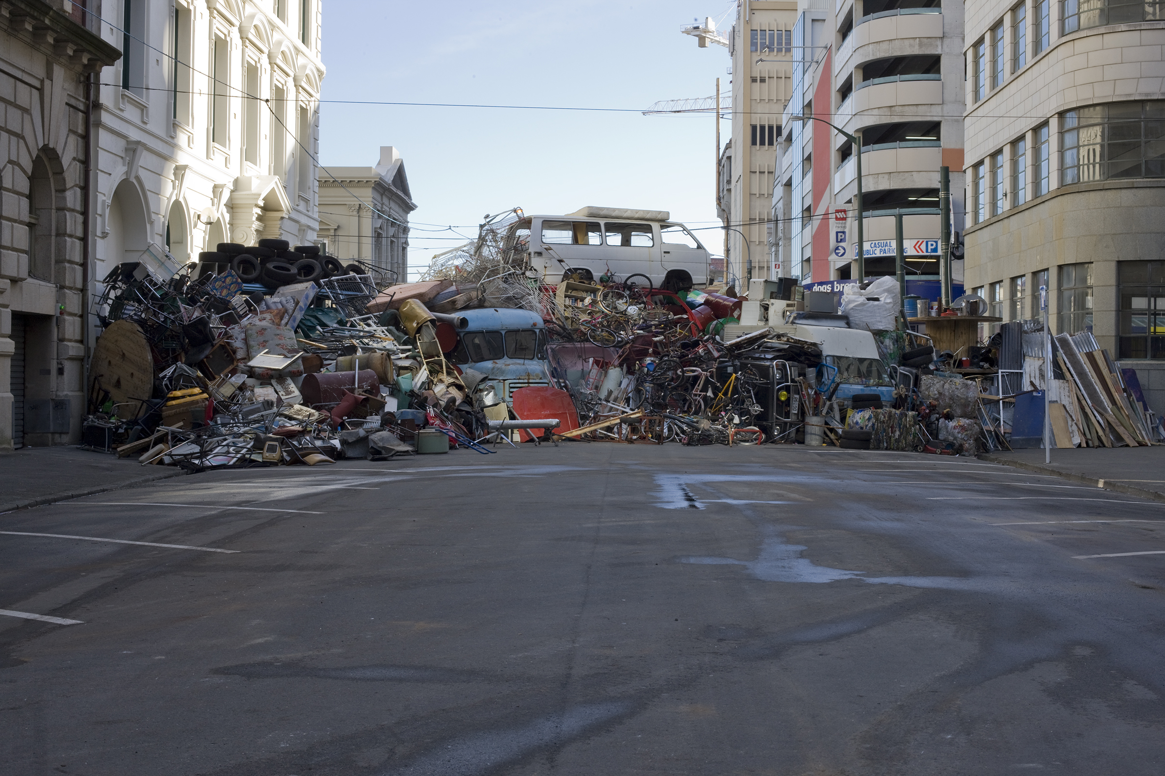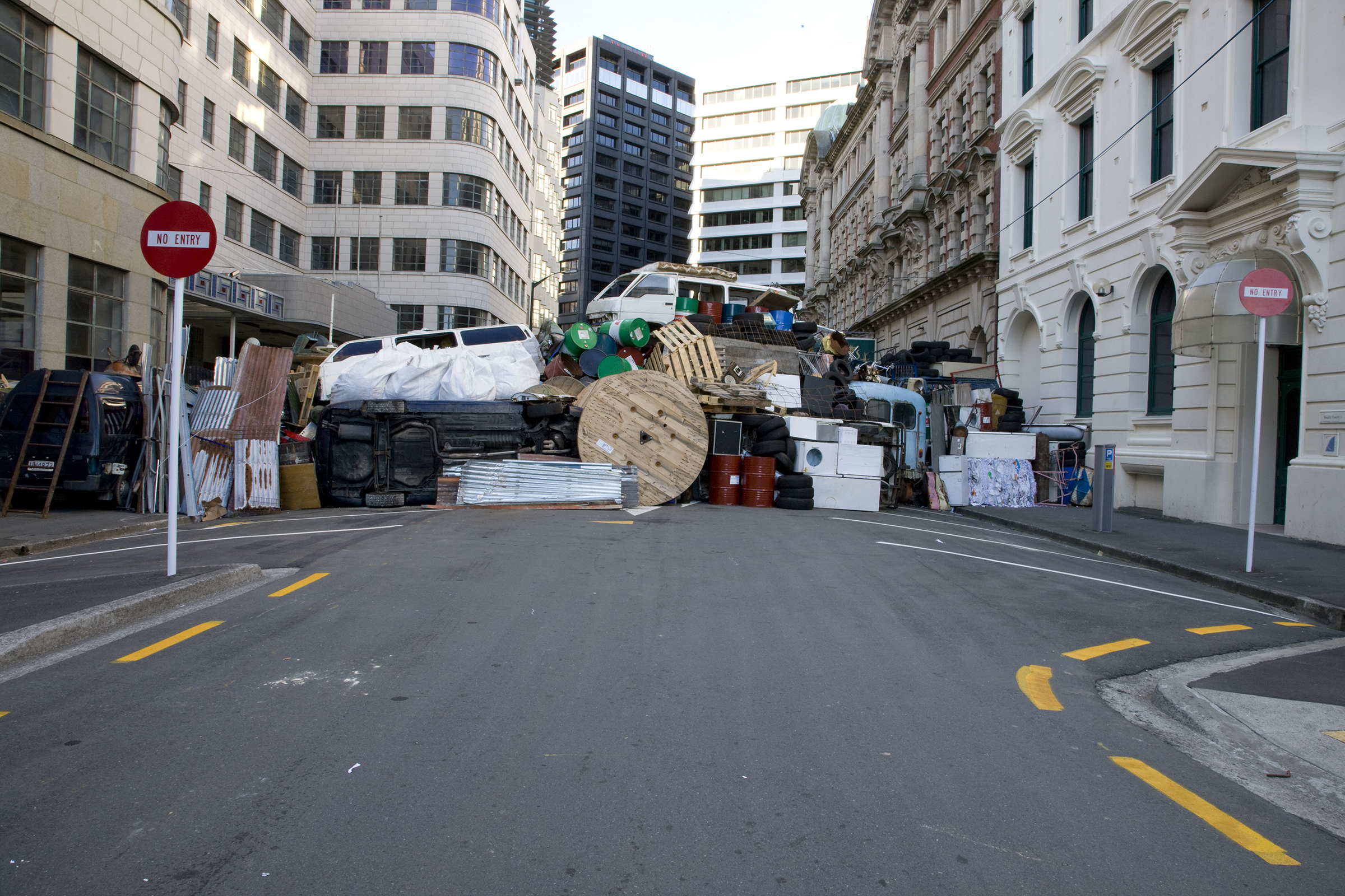 Passers-by were drawn towards this massive behemoth formed from salvaged materials. The barricade was more object than political action, and its potency lay in its scenic splendour as a sculpture that fleetingly linked the theatrical and the quotidian with the catastrophic. Its construction began at midnight on Saturday, to its total disassembly and dispersal 24 hours later. Returning the sculpture’s contents to the dump and recyclers from which it was borrowed positions the artwork as a fleeting event: a transitory performance that leaves its traces only in the minds of those who witnessed it.