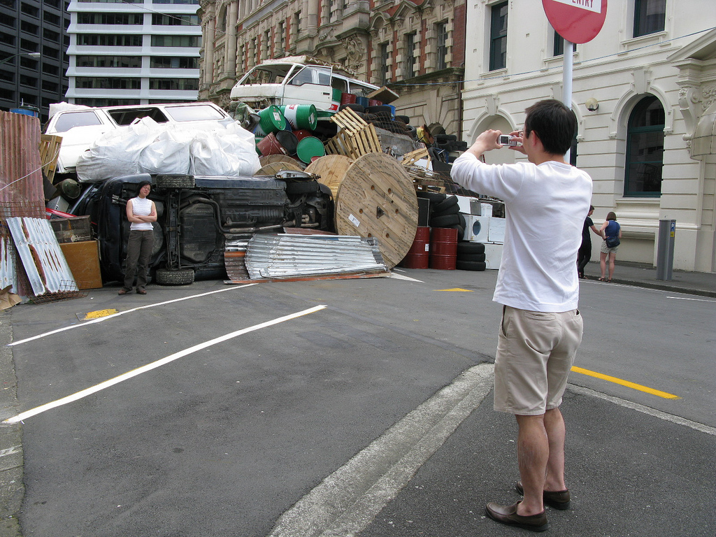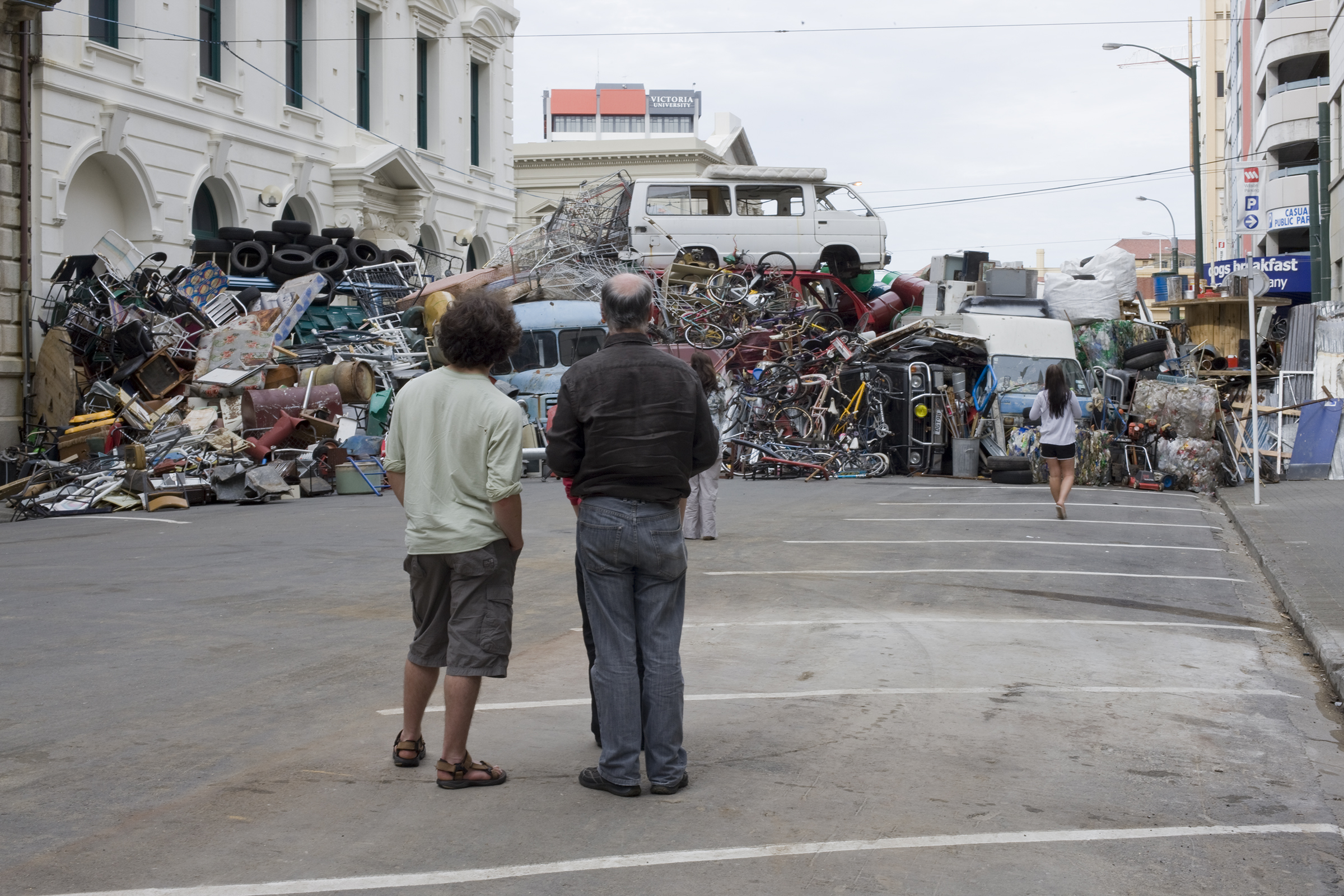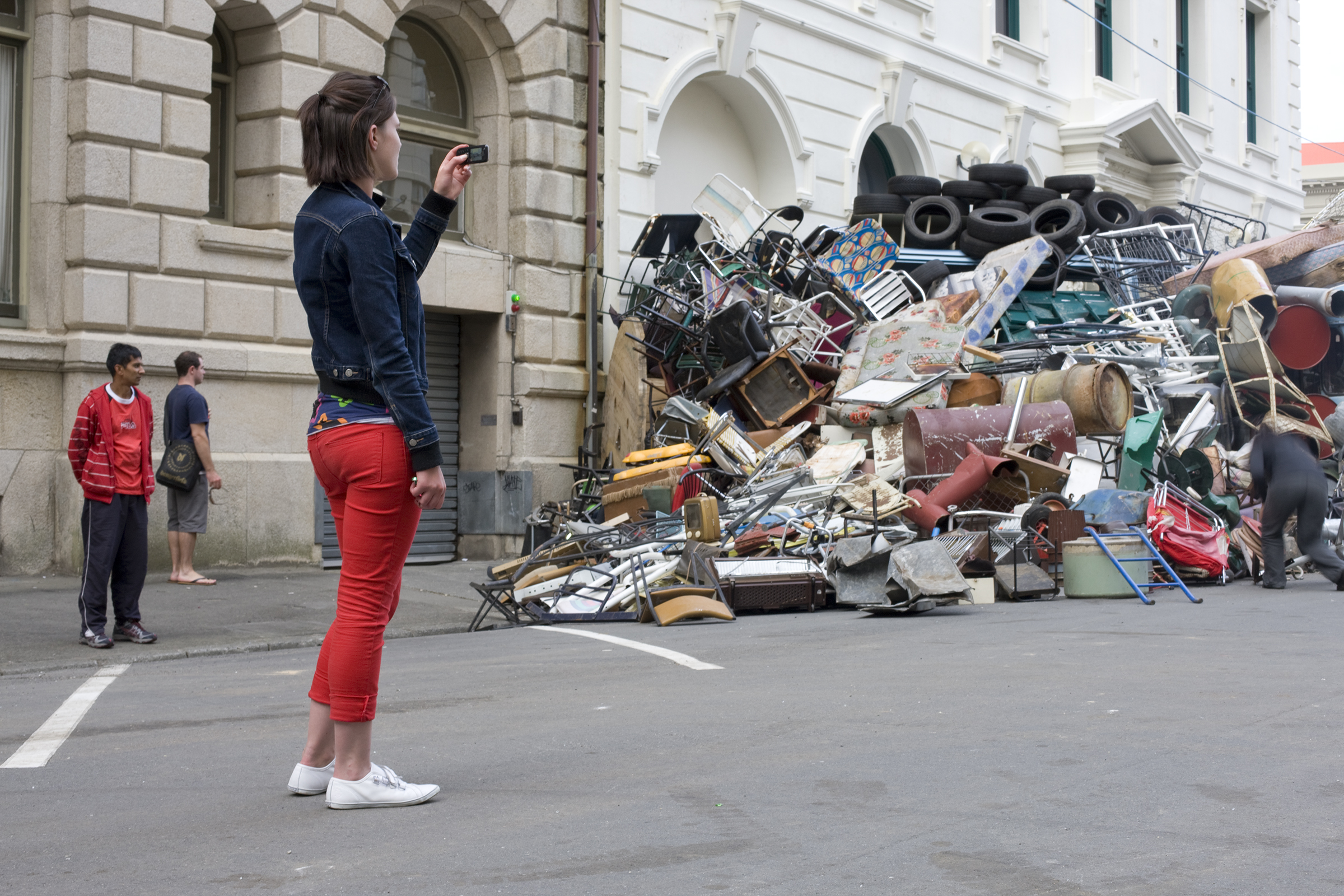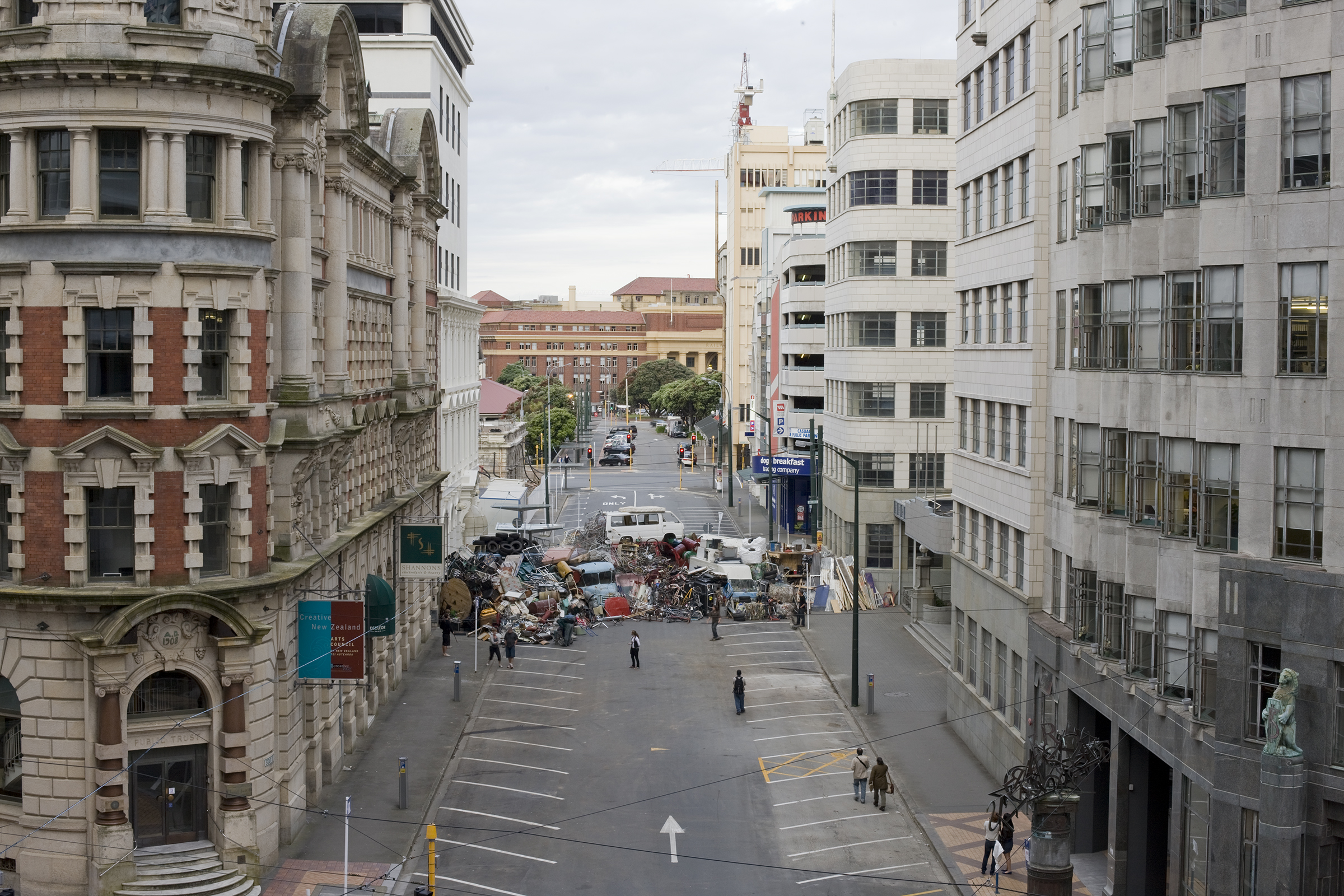 Passers-by were drawn towards this massive behemoth formed from salvaged materials. The barricade was more object than political action, and its potency lay in its scenic splendour as a sculpture that fleetingly linked the theatrical and the quotidian with the catastrophic. Its construction began at midnight on Saturday, to its total disassembly and dispersal 24 hours later. Returning the sculpture’s contents to the dump and recyclers from which it was borrowed positions the artwork as a fleeting event: a transitory performance that leaves its traces only in the minds of those who witnessed it.