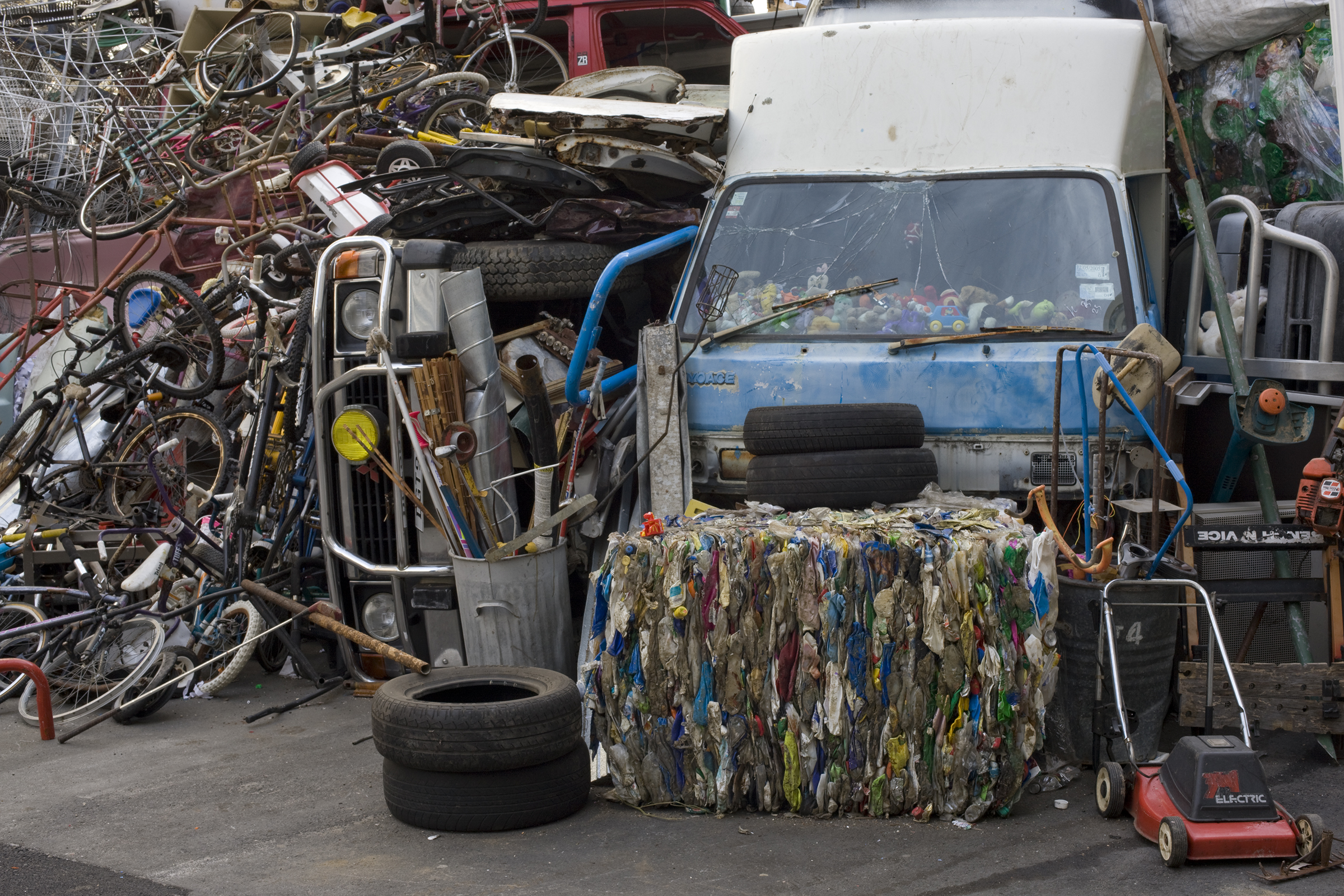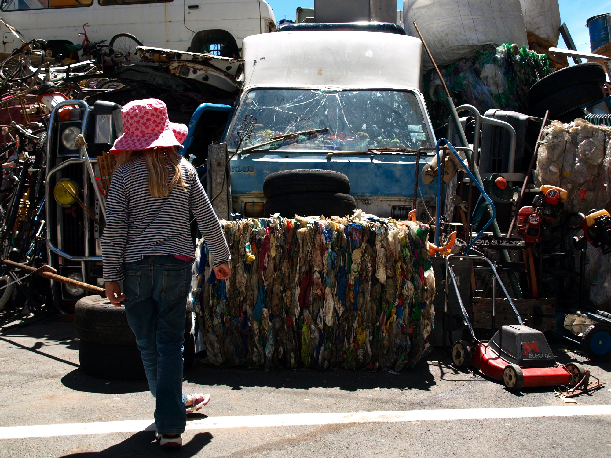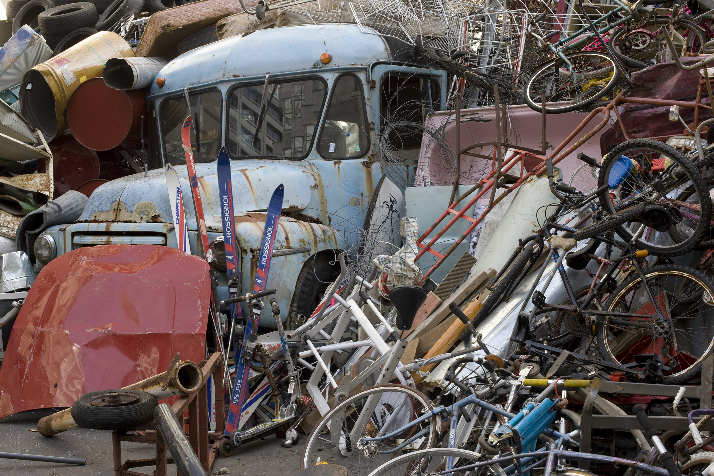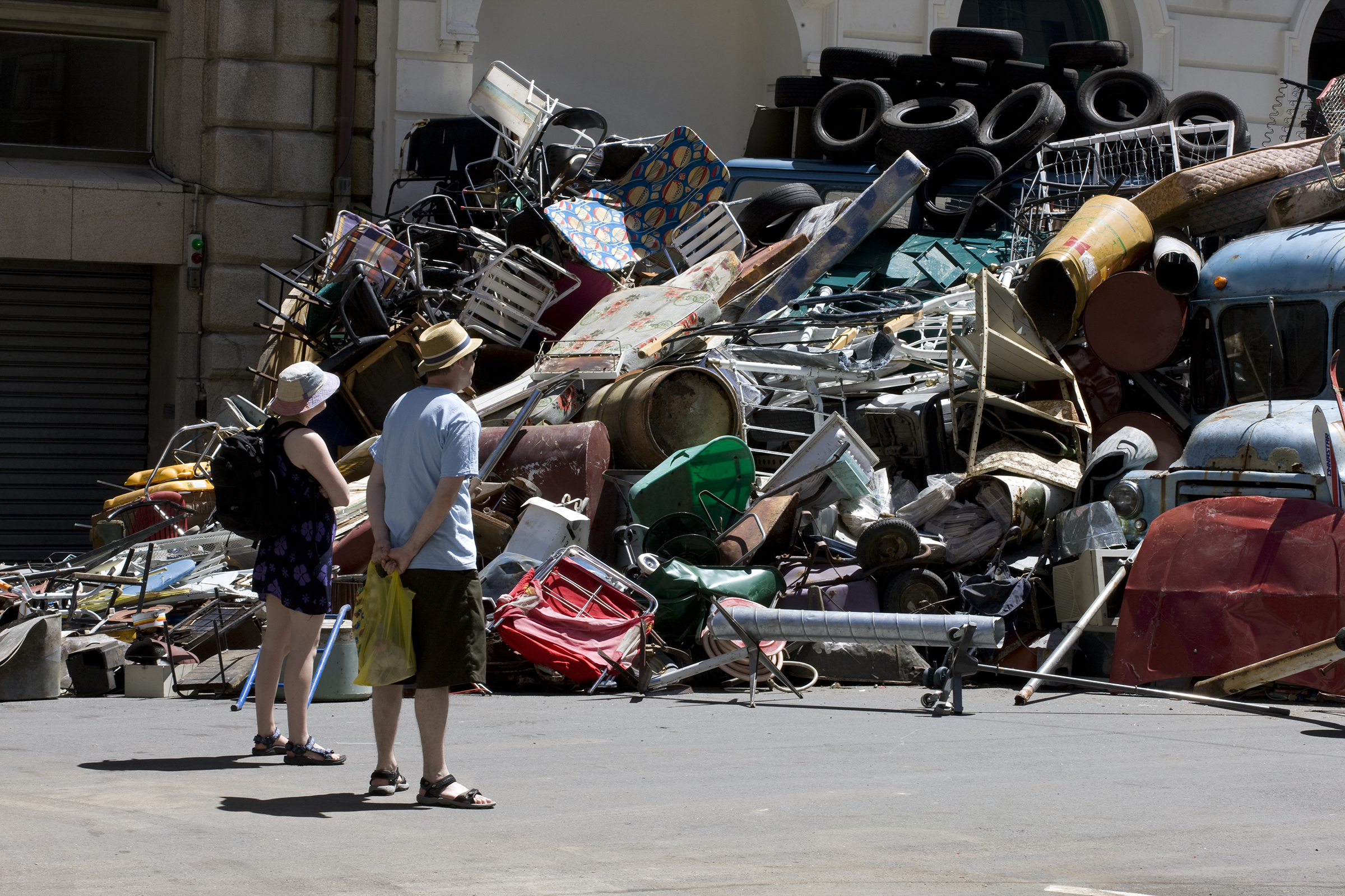 A monumental installation was formed from a colossal mass of inorganic rubbish borrowed from local recyclers and the dump: abandoned vehicles, tyres, compacted plastic, household appliances, bicycles, supermarket trolleys and – on closer inspection – garden and domestic objects, including a host of children’s toys.