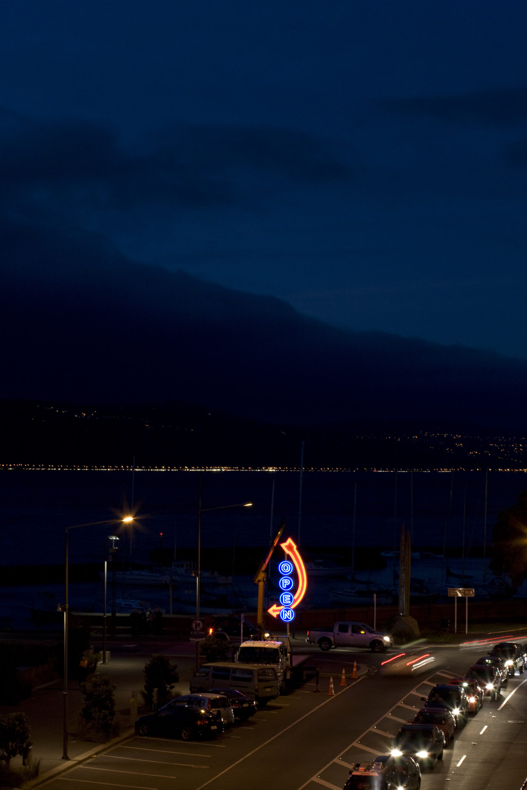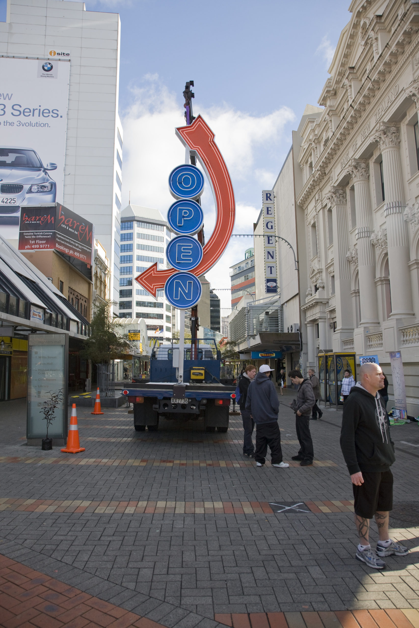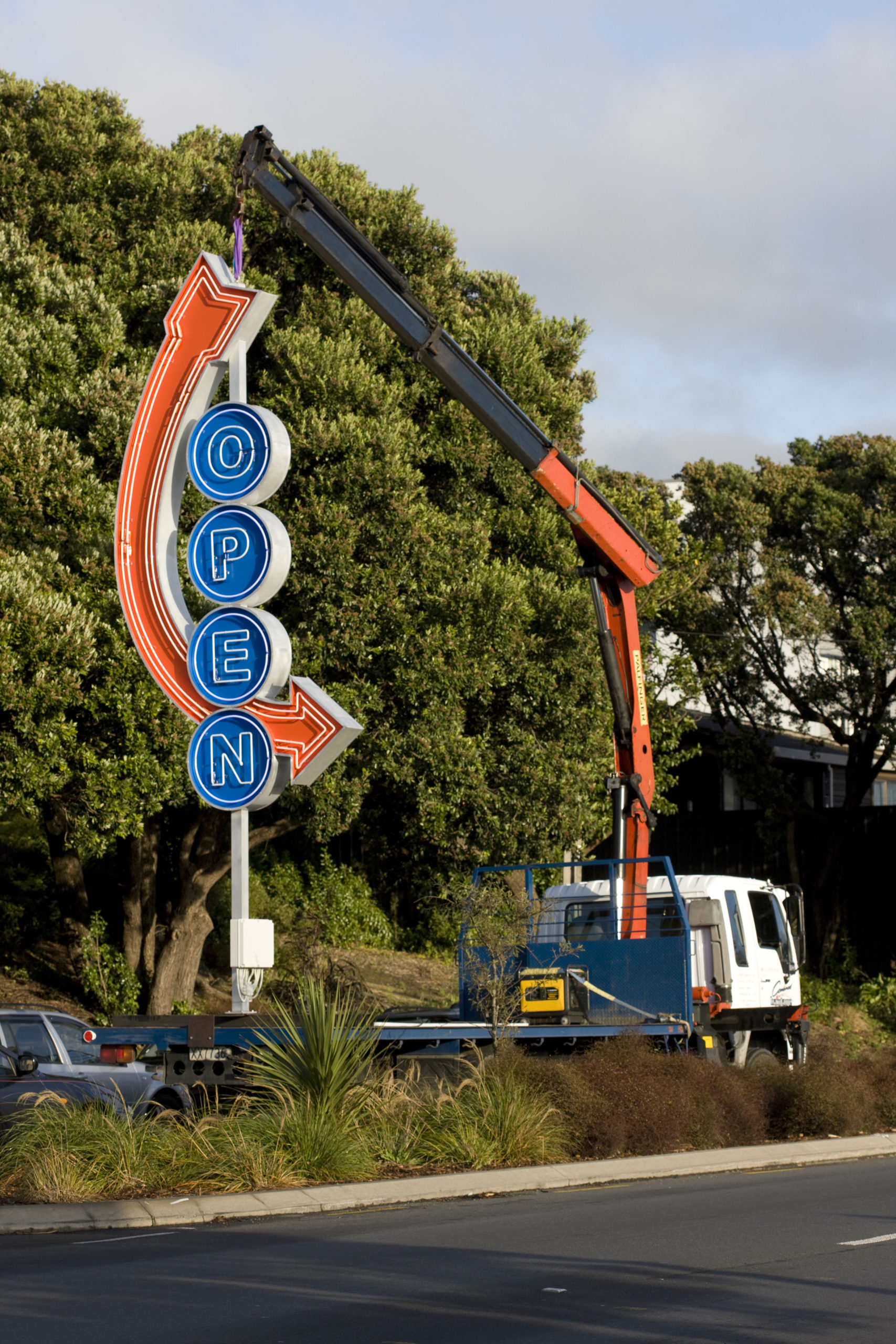 Conceived as an elusive finale for the One Day Sculpture series, Michael Parekowhai mounted a 4.6 metre-high neon sign on the back of a truck that spelled out the word ‘OPEN’ and toured it around the city. Displaying a unique blend of wit and seductive sculptural object making, Yes We Are played with the idea of contextual ‘displacement’, reflecting the nature of the One Day Sculpture series itself by embracing the guise of an unprescribed and unexpected intervention. Part-retro, part-Vegas, the sign accrued different meanings as it travelled from place to place across the day: